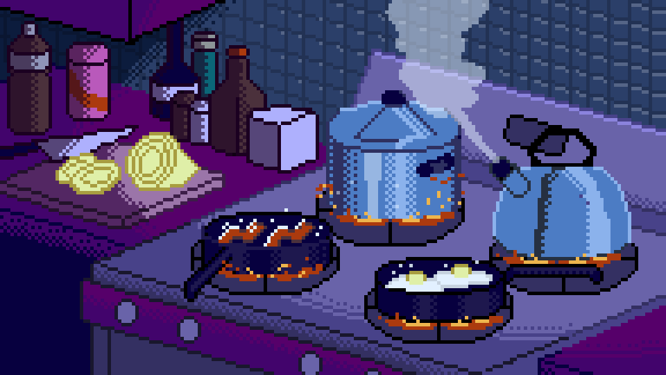 you chose to follow the little white rabbit. it led you to a dark factory in the back of the cafe. it was empty, full of machines that seem to stop working. the rabbit tries to run away but trips and traps itself inside one of the boxes.